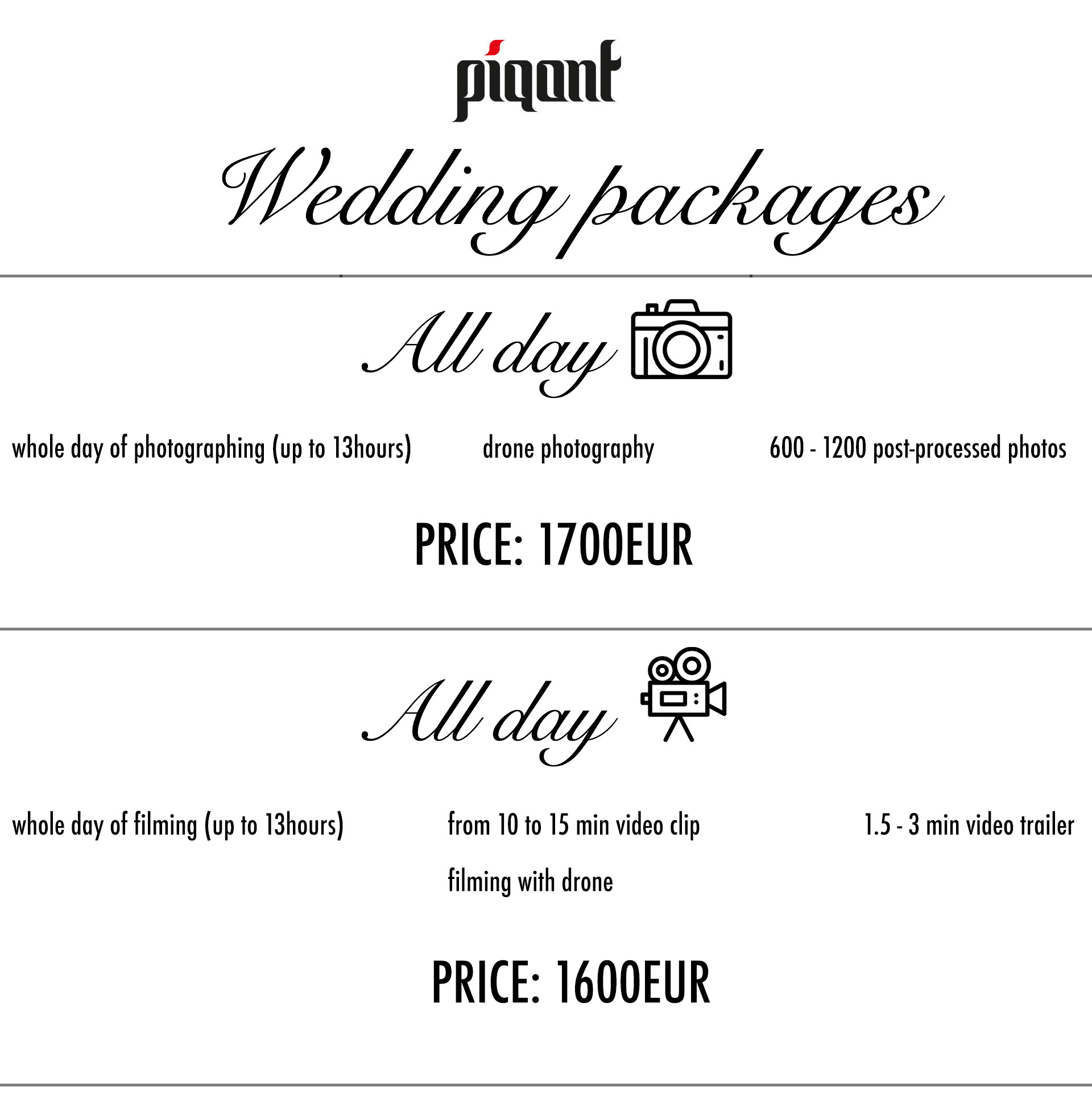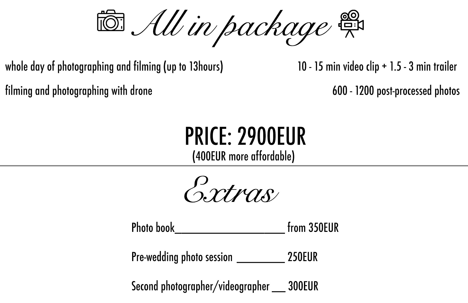 We would be thrilled to catch these beautiful impressions, because we have a comprehensive package of wedding memories. Every wedding is unique, so we pay particular attention, with new ideas and new locations scouting. You will trust us your desires and we will propose how is best to implement it in your wedding day. We will dedicate our devotion to you with a professional attitude and we will hand over an unforgetable product.